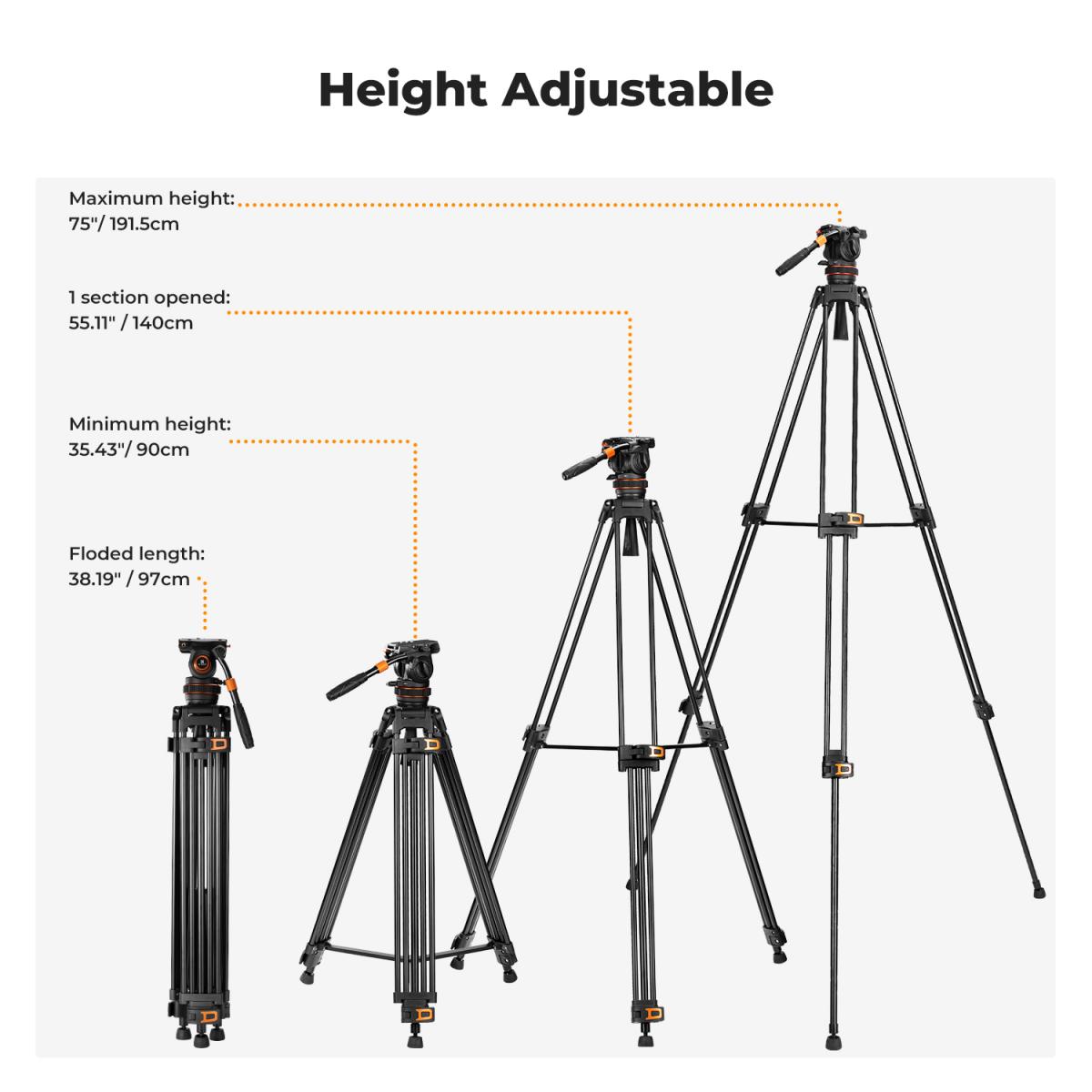 Versatile Hydraulic Damping: Achieve flawless camera transitions in both horizontal and vertical directions. The fluid head offers vertical angle adjustments from 75° to 90°, making it ideal for video captures and meticulous still photography.
