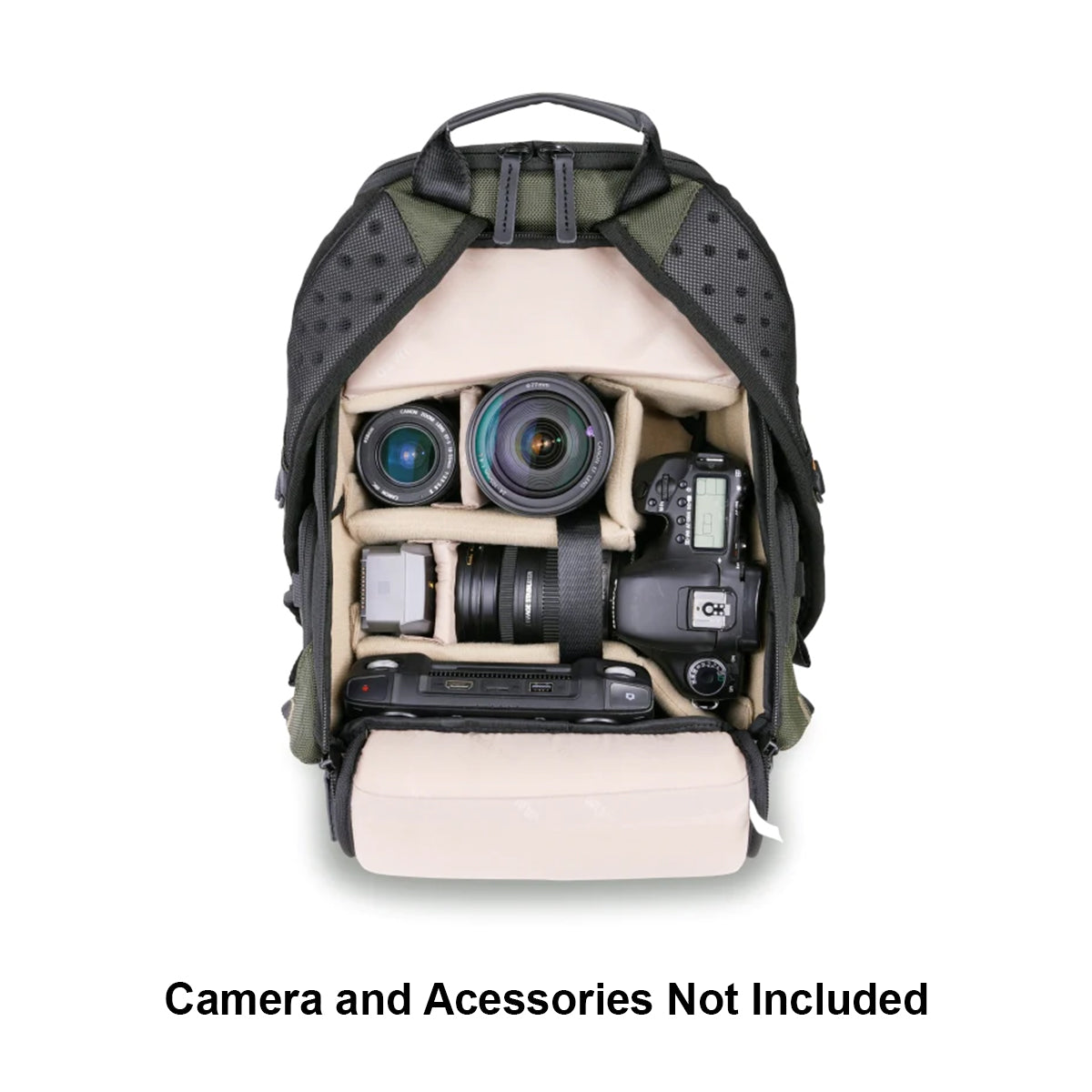 Dividers Configuration: Customizable dividers for full equipment use or configured as a daypack with top access for a camera with a tele-lens attached.