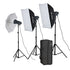 VL 300PLUS Novel kit consits of: 3 X 300W flash Heads, 3 X Light Stands, 2X Soft Boxes, 1 X Umbrella, 1 x Transmitter and 1 x Carry Bag